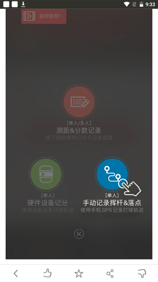 8、您也可以点击进入"手动记录挥杆&落点"记分方式,这个方式我们通俗称为击球轨迹记录记分或是沙盘真实还原记分,这个模式也是voOGOLF独创的高尔夫记分方式,简单易操作,可以实时记录您在击球起点真实位置,并可以记录击球距离,击球球杆型号,推杆,罚杆等关键数据,真实图形化还原您的每一场球的经历,便于您对自己的打球的回顾和分析。很多球友记录自己的小乌球和珍贵的老鹰球,难得的一杆进洞,并可以通过微信等互联网方式快速分享给您的朋友,或是数据直播。还等什么,快来做一个属于自己的击球轨迹记录吧!