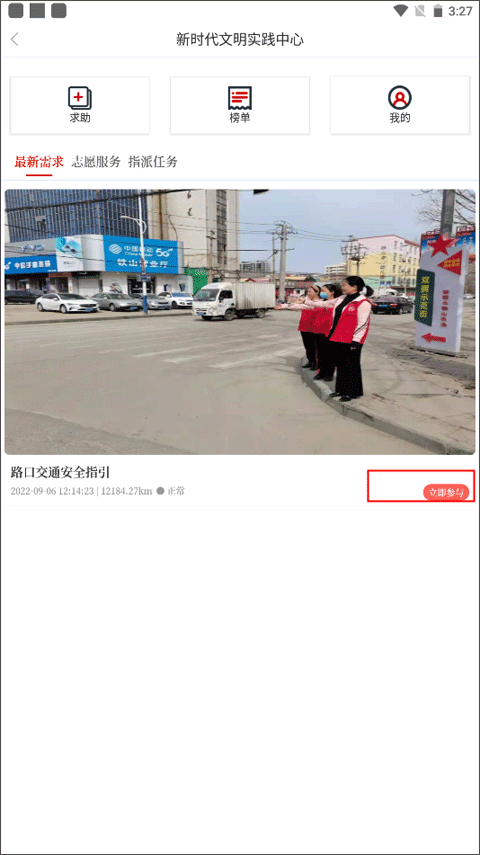 2、在这里你会看到很多最新发布的志愿者活动,你可以在这里进行求助,也可以点击立即参与;