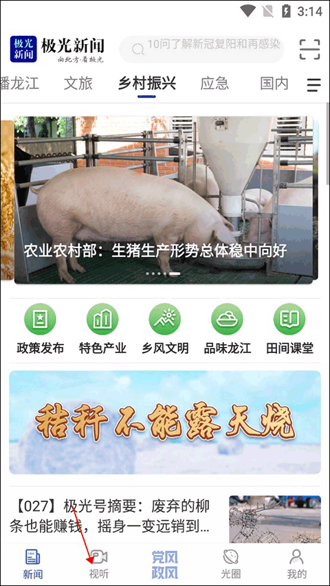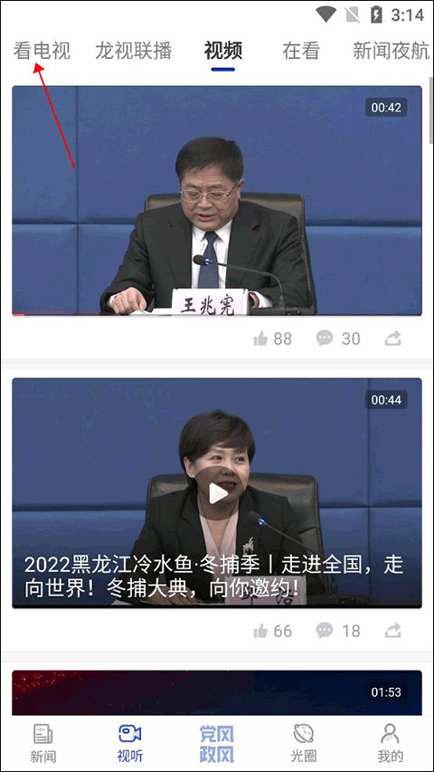 在进入软件后我们可以查看到底部有着五个进入其他页面的入口,分别是新闻、试听、党风政风、光圈、我的,点击这五个人口都能通向对应的界面,我们先点击视听,进入视听界面;