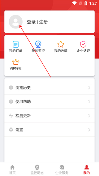1、首次使用时可以进入应用的【我的】页面中点击左上角的头像图标(下图红色箭头所指区域)