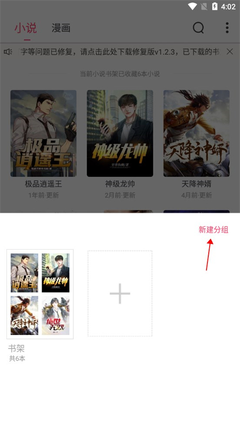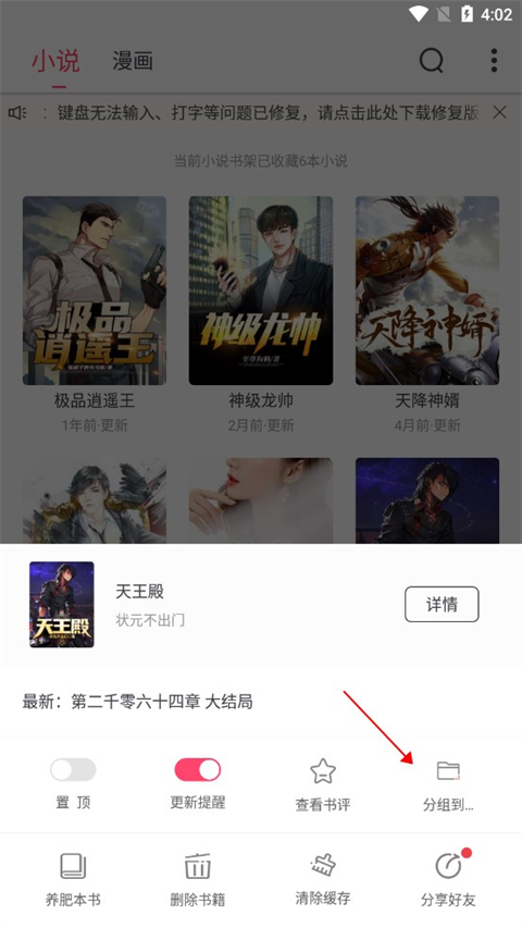 1、在书架界面长按小说,弹出界面点击分组功能。