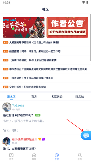 【实时互动】酷匠APP提供了多种用户之间的互动功能,你可以在书评区与作者或者其他读者互动,还可以在社区中分享你感兴趣的话题哦