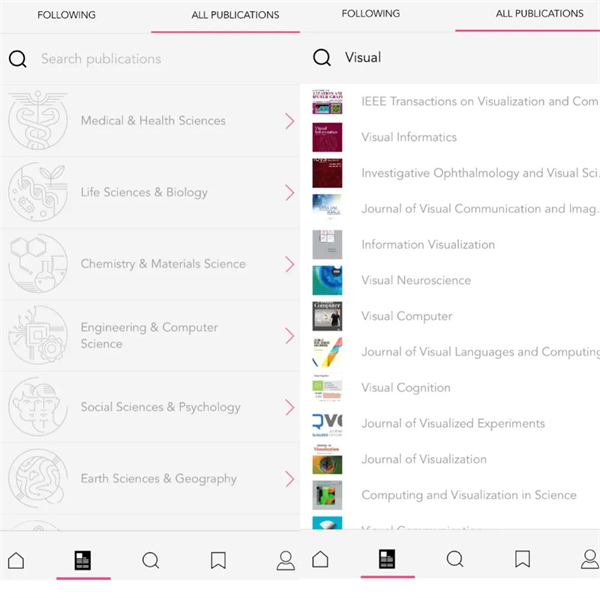 下载App注册之后,选择App下方的期刊按钮,然后打开右上方ALL PUBLICATIONS,可以在不同的学科领域查询或者直接搜索期刊的名称,然后直接关注即可。关注后便可以在首页浏览到该期刊的最新动态了。如果所关注的期刊是Open Access,还可直接打开原文链接下载,同时支持App内分享和App 外分享(比如,微信)。