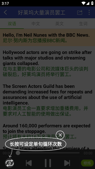 4、点击进入新闻详情页就直接开始播放英语朗读,长按左下角可以设定单句循环的次数