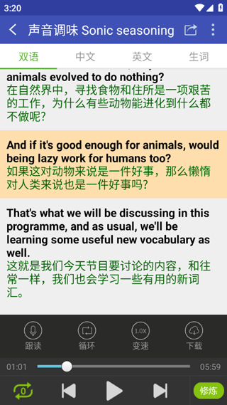用了一段时间后发现,里面的听力训练特别实用,尤其是单句循环和复读功能,对攻克发音问题很有帮助。而且界面设计简洁,操作起来也方便。我个人觉得这个软件挺适合需要日常英语学习的朋友们,特别是想提高听说能力的人,可以试试看。