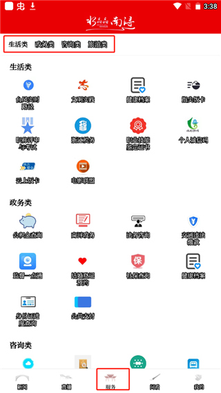 3、点击服务,里面提供生活类、政务类、咨询类、旅游类等等方面的服务;