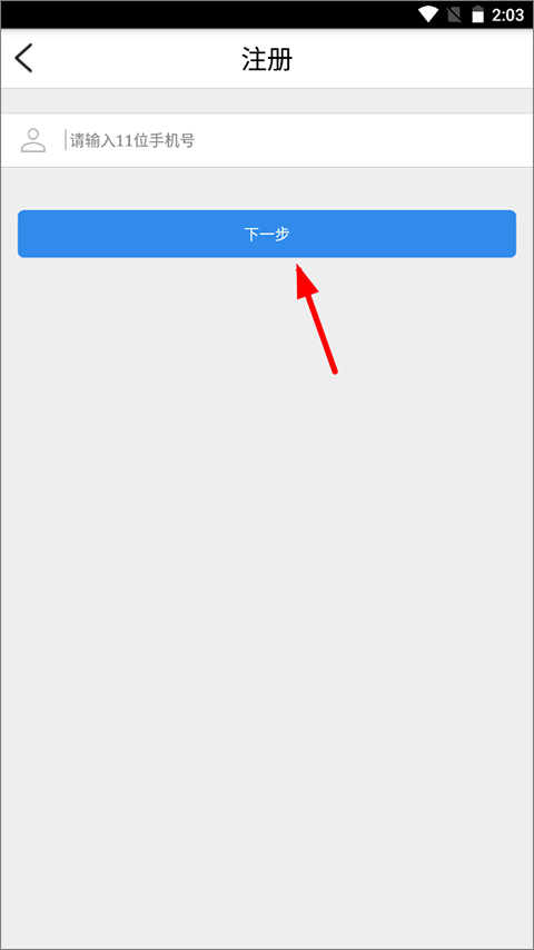 3、进入注册页面,用户输入手机号点击下一步即可;