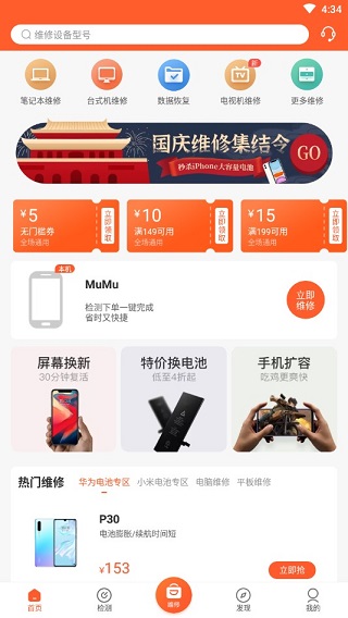 2、在首页的大部分的选择中,基本能了解该产品主要维修的领域包含,除了常见的苹果、华为及小米维修以外,还有AirPods、笔记本、台式机、数据恢复、电视机维修及其他更多品类。与此同时,你还可以搜索维修设备的型号与机型。