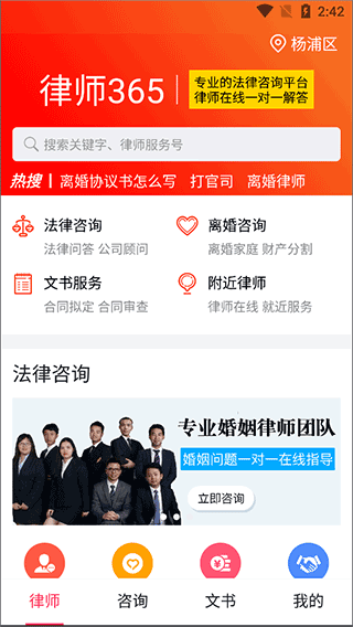 这款律师365app真是个找律师的好帮手!界面简洁明了,功能强大,想咨询法律问题或者找附近的律师都能轻松搞定。特别是离婚咨询这种敏感话题,直接在平台上就能找到合适的律师,还能了解费用,真的很方便。