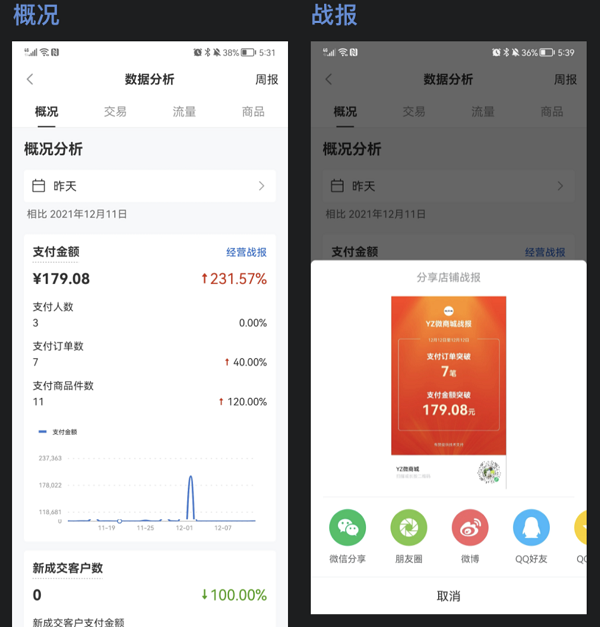 前往 常用应用 - 数据统计 - 概况,在支付概况卡片右上角点击“经营战报”功能,即可触发业绩海报分享。