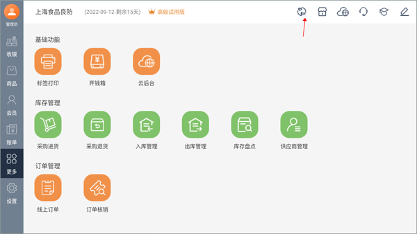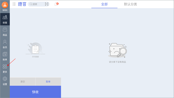 注意:小编这里将以德客的商超零售行业收银系统为例,因为每个行业所进入的界面将会不一样,教程仅供参考:1、注册完账号后,进入到系统内部,会默认看到收银功能界面,点击切换到“更多”界面。