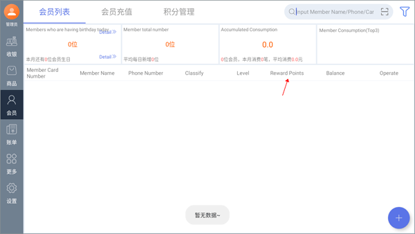 【会员管理】 会员信息完整记录、会员信息批量导入导出、会员在线充值充次、会员卡补卡\\挂失、会员加减积分、会员积分兑换等。