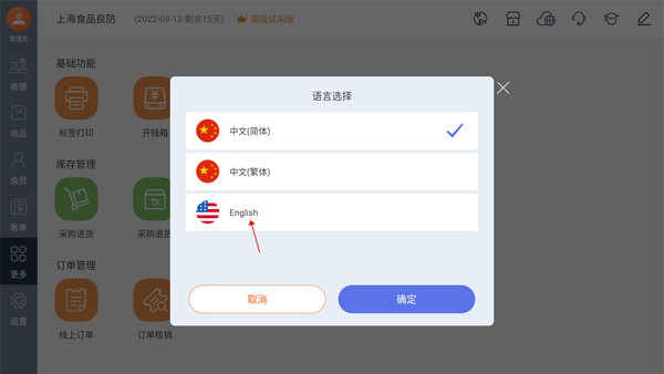 德客移动收银如何切换成英文模式
