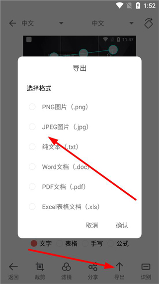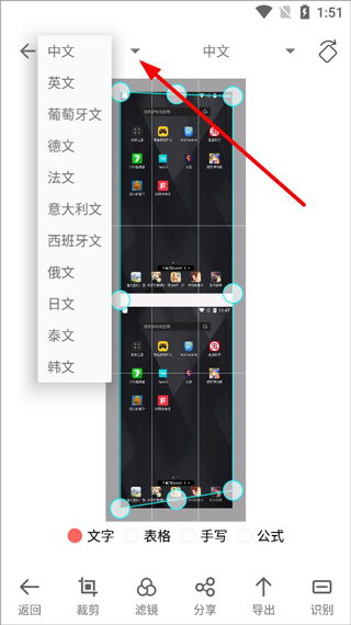 3、识别页面左上角可切换识别的语言,点击识别图片中的文字并导出需要的格式即可保存;