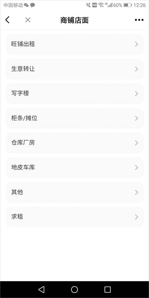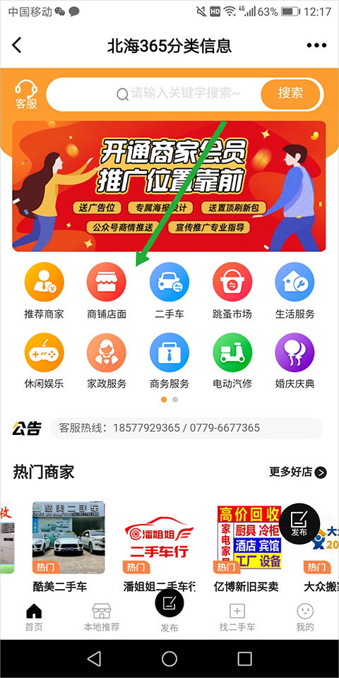 1、进入【首页】点击【商铺店面】(下图绿色箭头所指区域)