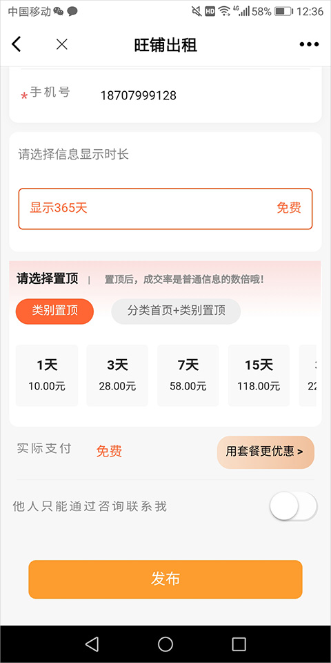 5、在打开的新页面中,填写相关资料,上传商铺实际图片或视频,标题要有代表性,不能随意取名,商铺地址要详细无误,否则平台经查验不予以过审,如果有会员可选择置顶设置,如果没有平台也可免费显示365天。所有信息确认无误后,点击【发布】即可免费发布