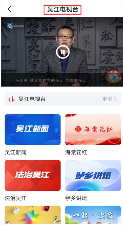 ●电视:不仅实时播出吴江电视一套节目的在线直播画面,还将“吴江新闻”“法治吴江”“一起出发”“鲈乡讲坛”等众多精品栏目进行了集中式呈现,电视直播与视频点播功能兼具,满足市民的不同观看需求。
