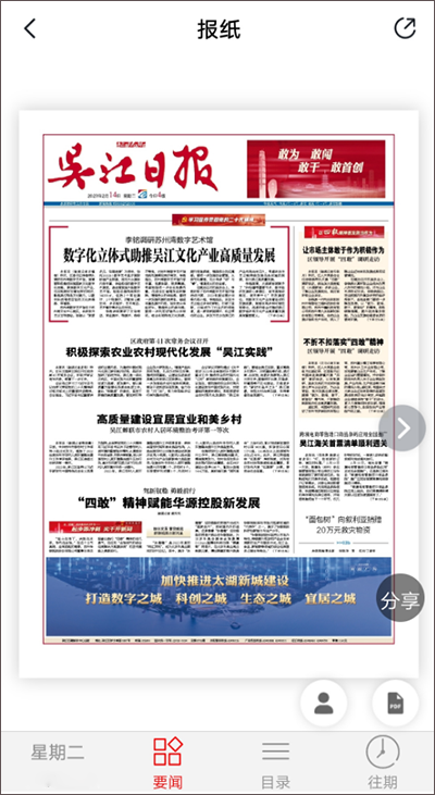 ●报纸:接入数字报纸系统,市民可在客户端上看到近期《吴江日报》的全部图文内容,支持目录和日期查看功能,支持全文本的语音朗读功能,便于中老年人阅读、使用。