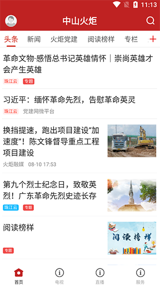 2、首页:头条、新闻、火炬党建、阅读榜样、专栏;