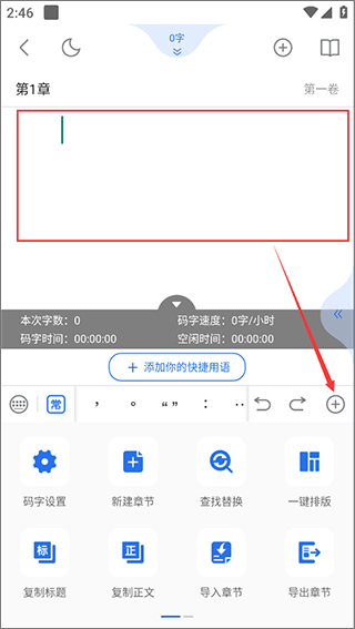 3、随后返回首页点击新创建的书籍进入,就可以开始编辑第一章节了,点击右下角的“+”按钮还有常用功能供用户使用;