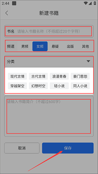2、填写书名、简介等信息,然后选择频道和类型,在点击“保存”即可成功创建;