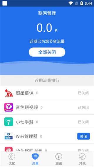 6、一键优化手机联网程序,可以直接关闭应用程序使用手机流量,从而帮助节省流量;