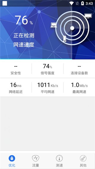 1、利用软件进行网络检测,能够帮助检测当前使用网络的情况2、当使用WiFi网络时,可帮助您加强WiFi信号,提升网络速度