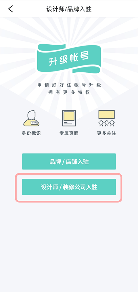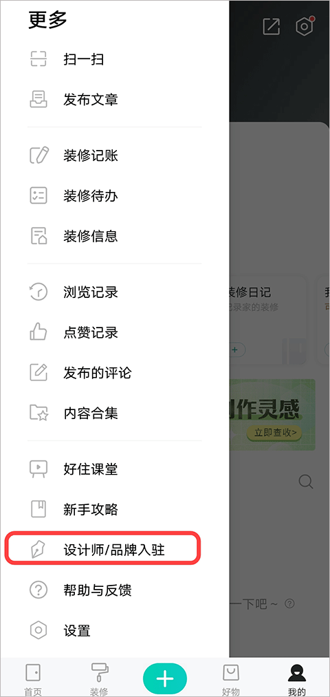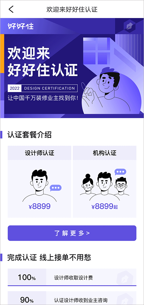 您好,在好好住APP找到「我的」点击左上角「更多」,点击「品牌/设计师入驻」选择要申请认证的身份即可线上申请。