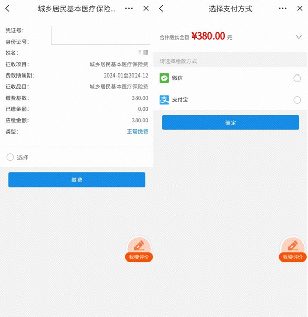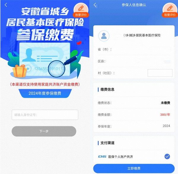 3、在服务页面输入参保人的身份证号后点击“下一步”,确认参保人信息后在支付渠道选择“医保个人账户共济”,最后点击“立即缴费”即可。