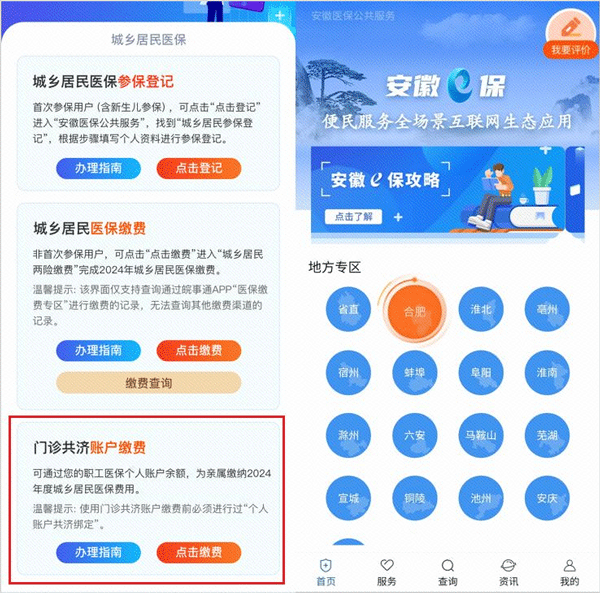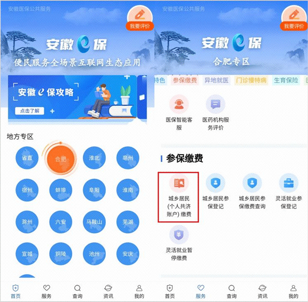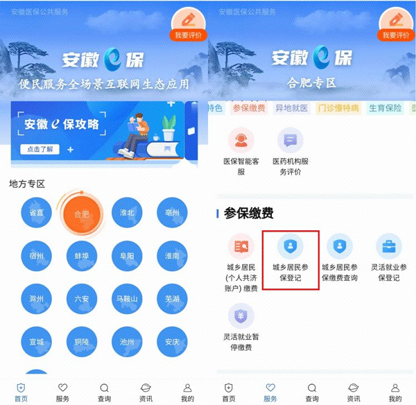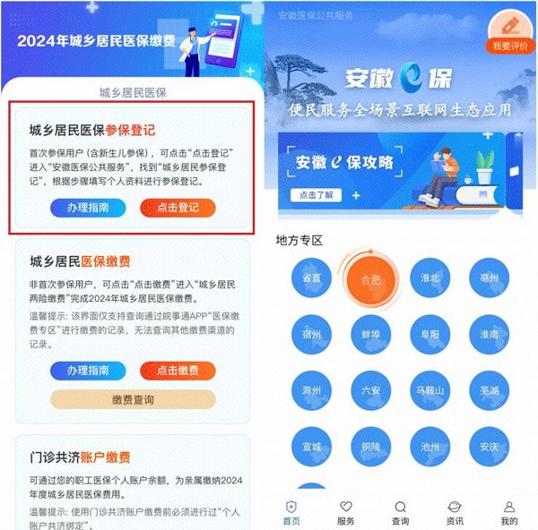 2、选择你所在的区域,这里以“合肥”为例,在“服务”页面找到“参保缴费”版块,选择“城乡居民参保登记”服务。