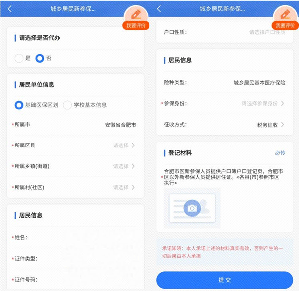 3、在“居民参保登记”界面,根据自身情况填写相关信息后点击“提交”即可。