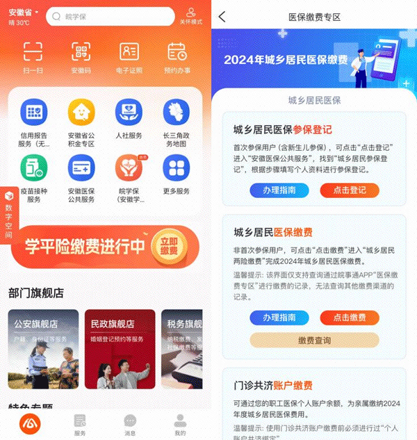 皖事通医保缴费平台是专为安徽市民们打造的一款集政务服务、公共服务和生活服务于一体的移动应用,而医保缴费是皖事通app中的一项重要功能,通过该平台,城乡居民可以方便地进行医疗保险的在线缴费,包括城乡居民基本医疗保险和城乡居民两险缴费等,同时还支持自缴和代他人缴费,用户们只需要输入自己的身份证号就可以查询到自己的医保信息,并对医保进行缴费操作,支持支付宝和微信等支付方式。