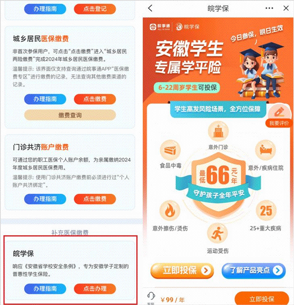 2、仔细阅读服务页面相关说明,选择投保方案,填写投保人信息(姓名、证件号码、学校类型),确认承保公司,即可立即投保。若想查询保单或进行理赔申请,可在皖事通搜索“惠民保险”,即可快速查看保单/进行理赔申请。