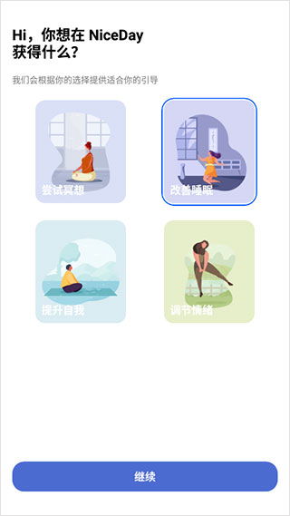 1、首先打开niceday软件后,选择想要获得什么,例如改善睡眠、调节情绪等等;