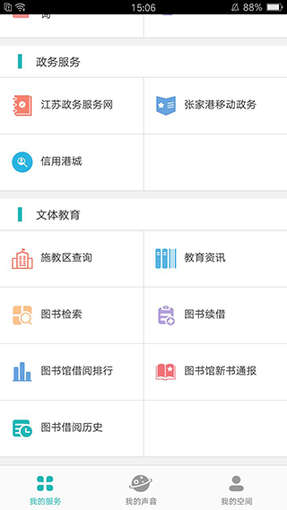 1、政务服务功能,能够进行相关的政务的查询服务,张家港移动政务服务、江苏政务服务等;2、施教区查询功能,能够进行相关的施教区的查询,了解相关的教育等的分布;