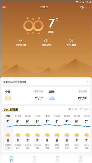 1、进入幸福天气预报软件后,最上方显示的是当天天气,下方显示的是24小时预报。