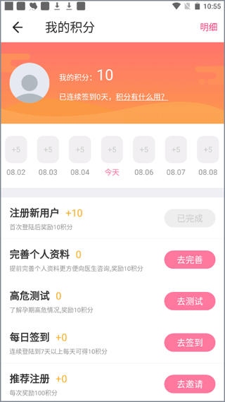 点击个人中心――健康档案,可以完善个人健康档案,记录个人孕期状况、个人病史、手术史、在用药物等信息。