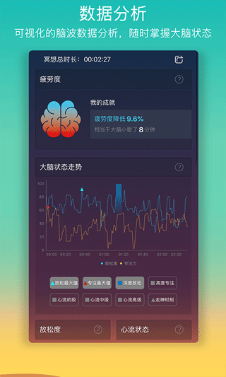 8分钟冥想app是国内首款专注冥想禅修训练的冥想数据记录分析工具,该软件完美结合先进的脑电波技术,以8分钟最小单位的冥想训练为核心,通过循序渐进的语音引导,配合BrainLink意念力头箍精确记录脑电波数据监测,为初学者提供最专业的效果反馈与学习建议,带来轻松愉快的学习体验。并且让冥想不在耗费时间,变得安全、简单全且有科学成效,从而最大程度地缓解疲劳,引导深度放松,绝对是白领、高端人士追求生活品质的科技减压神器!