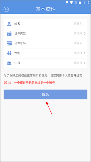 3、填写自己的证件上的相关信息,最后提交就可以了。要注意的是一个证件号只能绑定一个账号。
