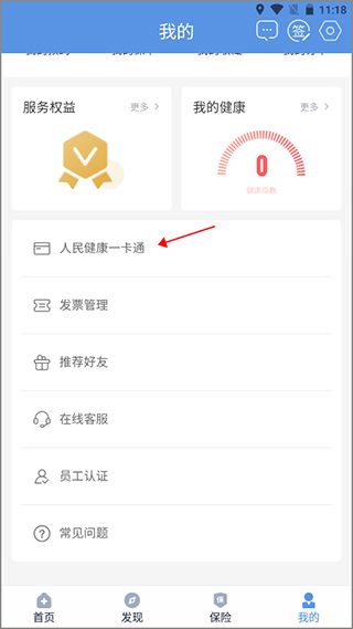 2、就会看到个人的各个功能,往下翻会看到人民健康一卡通这个功能,点击它。