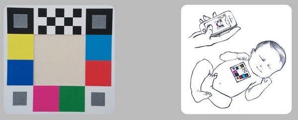 将比色卡放在新生儿的胸部,可自动识别,在判断图像质量、光照环境以及皮肤区域后会自动扫描拍照。妈妈们只需稳住相机,即可得到清晰的宝宝皮肤图像,将图像上传至云端服务器,黄疸拍照通过医学图像处理技术自动计算并返回黄疸数值。