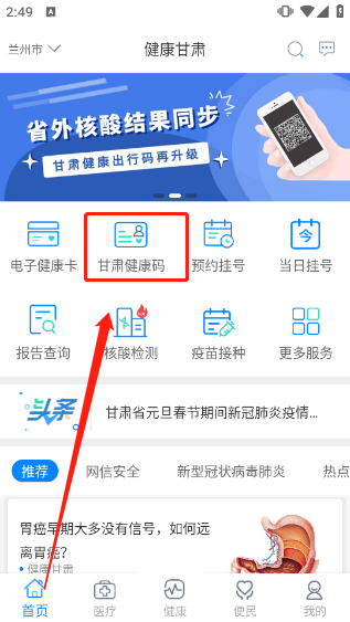 1、初次进入软件的用户,需要先为自己领取一枚健康码:在“首页”中点击“甘肃健康码”然后根据流程领取即可