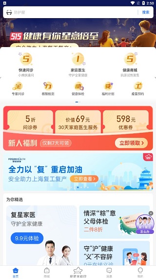 1、在“复星健康”App的首页可以在线问诊,也可以在健康商城购买全网低价药品。