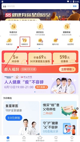 为深入贯彻落实中央指示要求,助推重点人群的“应检尽检”,“人民好医生”客户端联合复星健康,推出多城市新冠核酸检测在线预约服务。1、如图所示,登录“复星健康”App,在首页找到“核酸检测”。
