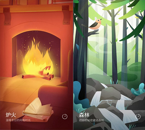1、进入应用,它默认推荐了五个场景,分别是:夏雨、森林、炉火、海洋、夏夜。