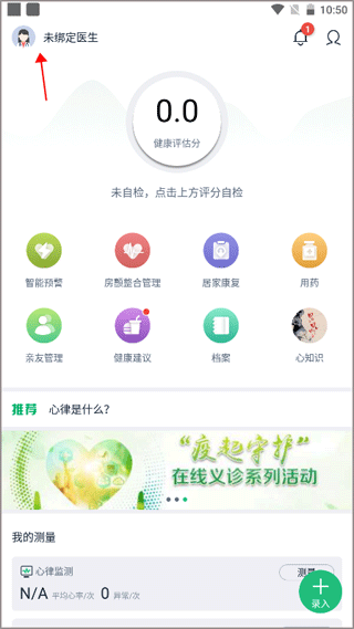 1、打开软件登录账号之后,点击软件左上角的“未绑定医生”。