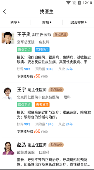平台除了按科室挂号以外,还为不太了解病种分科的患者提供按疾病查找选择医生的导诊功能,直接选择最擅长自身疾病的医生,让挂号更简单。