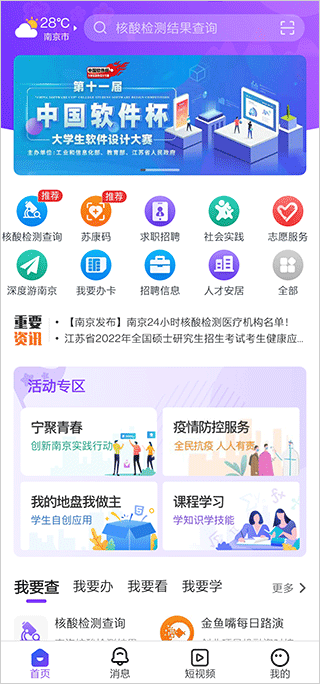 1、打开南京大学生版app后,在首页提供了核酸检测查询、苏康码、求职招聘等大量生活服务;