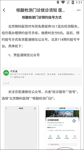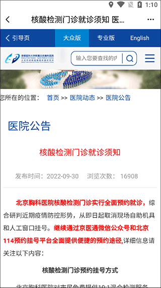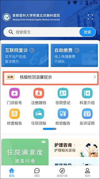 1、首先,打开北京胸科医院网上挂号app,在软件首页的轮播公告中找到并点击“核酸检测温馨提示”;
