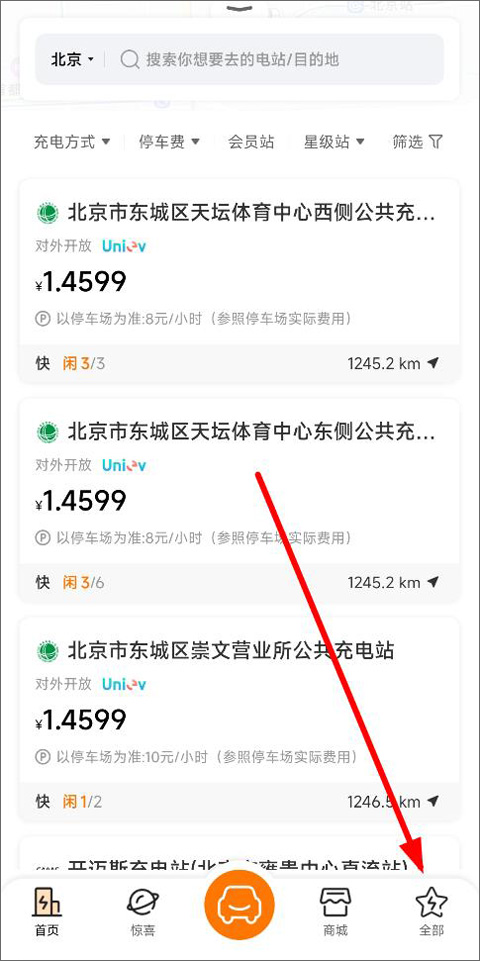 1、打开星星充电桩app,登录进入首页,首页优先展示当前定位点闲置充电桩,还有电站、账户充值、扫码充电、订单等功能栏,点击全部;